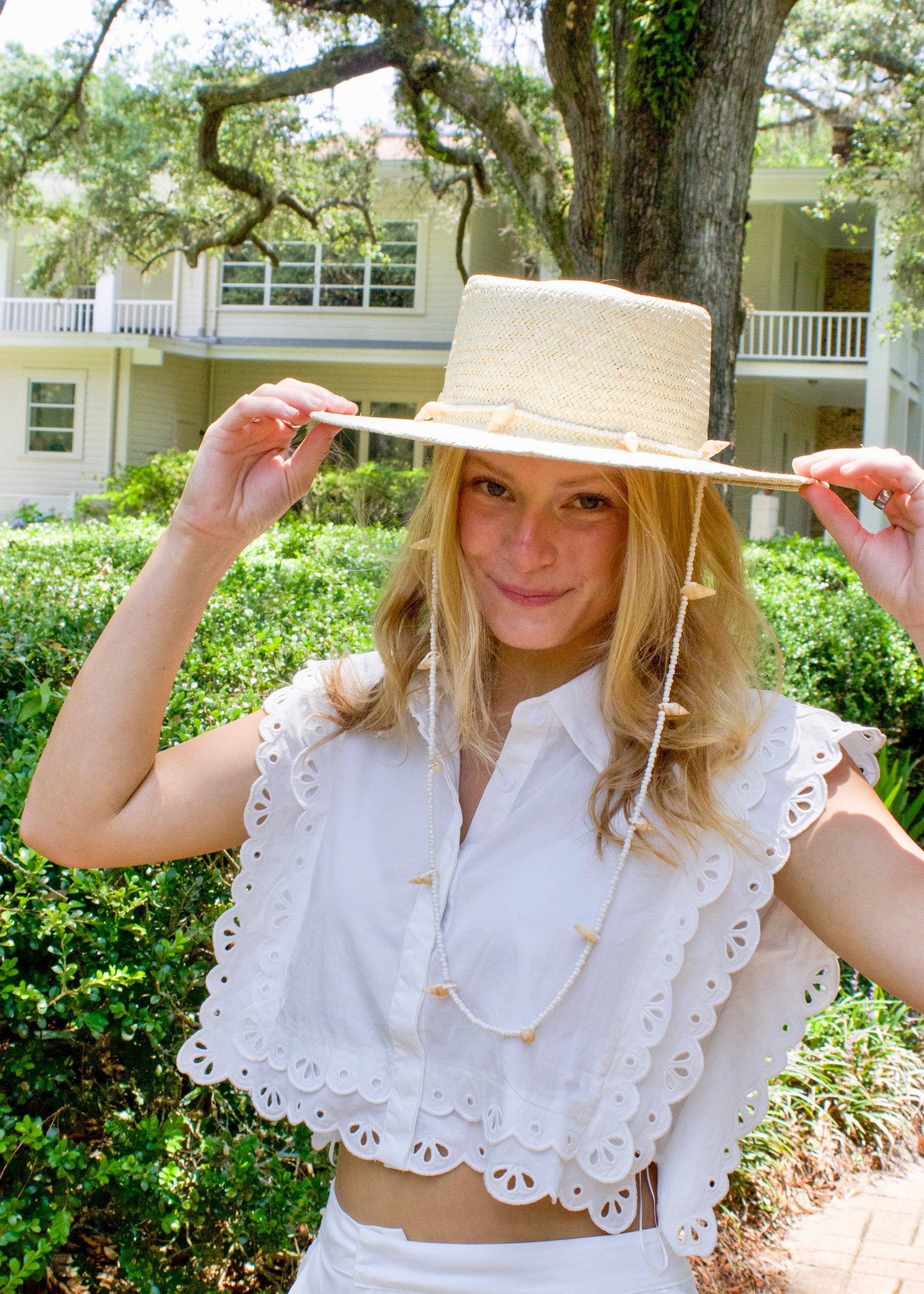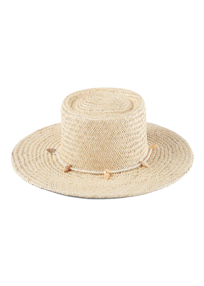 - Off-White 100% palm straw boater trimmed with custom beaded seashell.