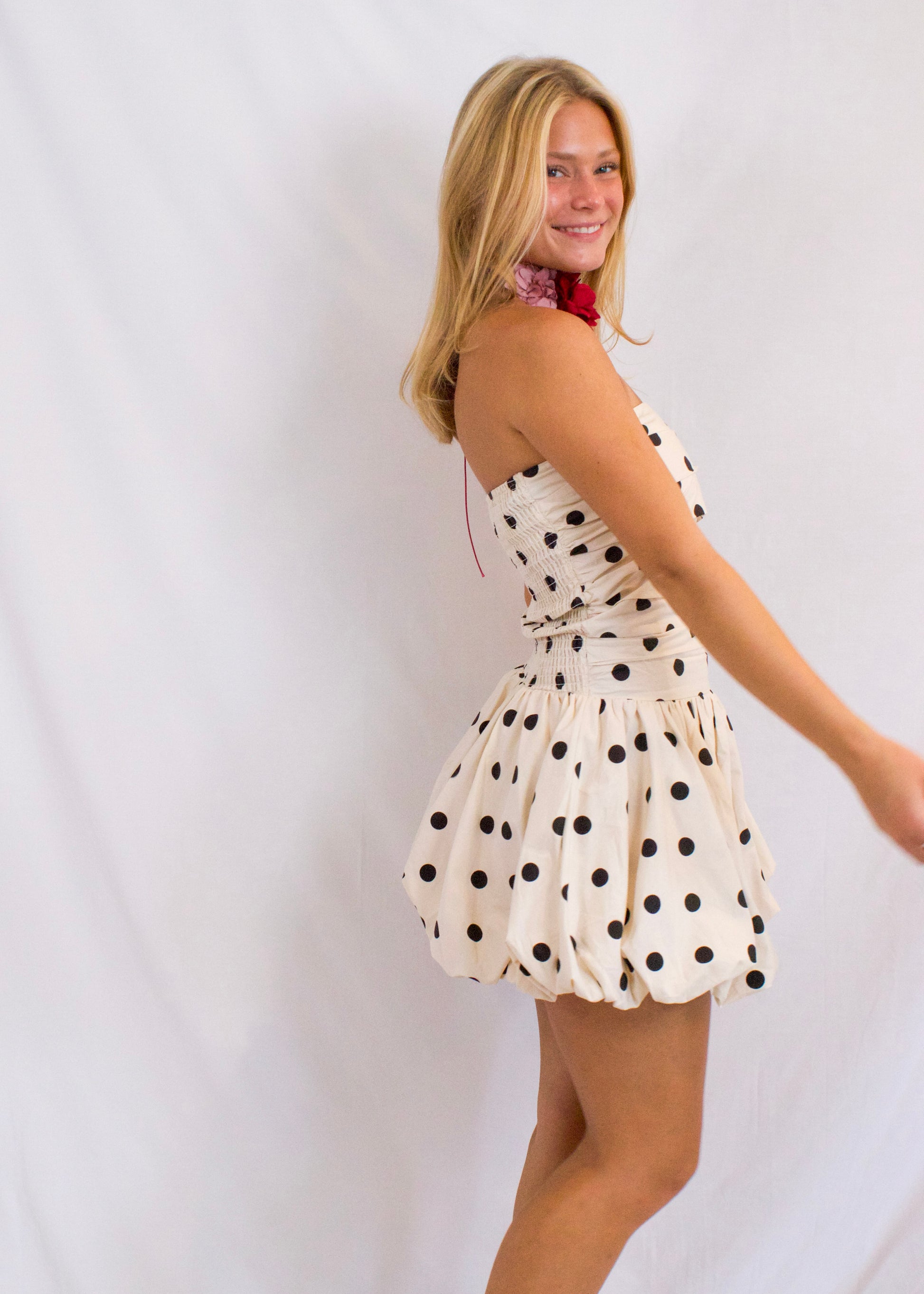 The Dion Bubble Dress. This strapless mini dress features a fitted bodice and a playful bubble hem skirt, creating a flattering silhouette that turns heads. The classic ivory base with bold black polka dots adds a vintage-inspired flair, while the ruched waist enhances your shape with elegant texture. Perfect for making a statement at any event, this dress combines fun and sophistication effortlessly.