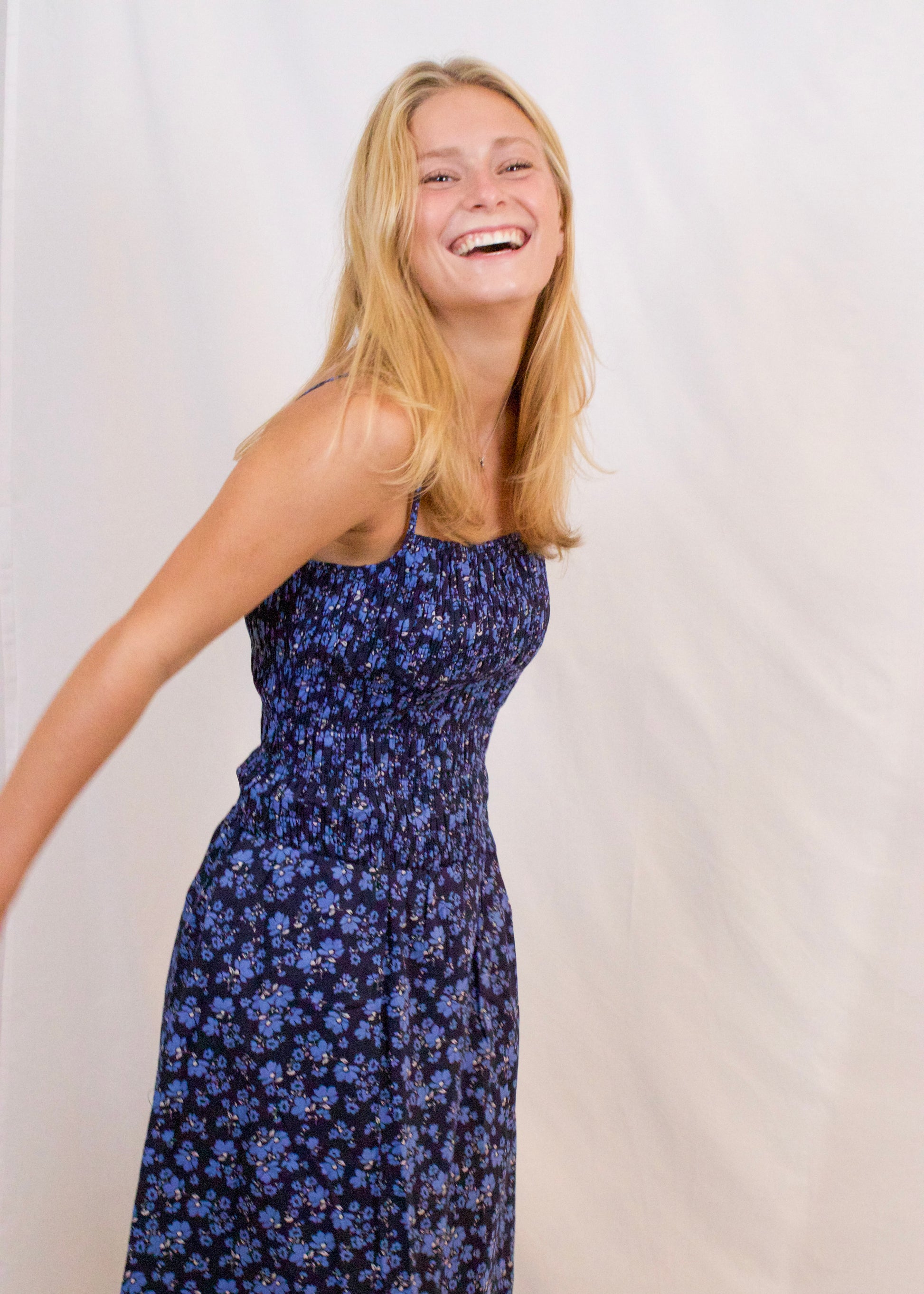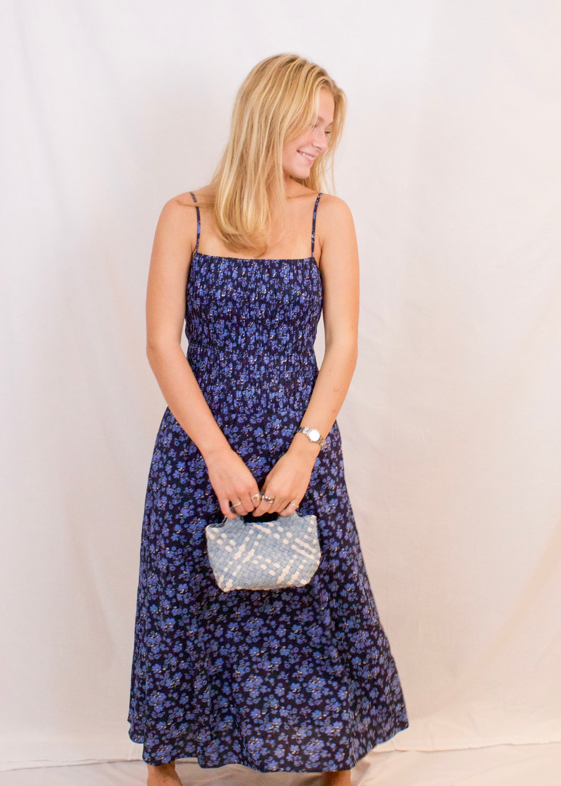 Embrace effortless elegance with this Floral Print Smocked Midi Dress. Crafted from lightweight fabric, it offers a soft drape and all-day comfort. The blue floral pattern on a deep navy base adds a touch of charm, while the smocked bodice and waist provide a flattering, flexible fit. Adjustable thin straps and a straight neckline enhance its feminine appeal. Perfectly midi in length, this dress transitions seamlessly from casual outings to evening events.