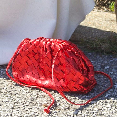 This Metallic Mini is a small, structured pouch bag in a striking metallic red color. It features a woven pattern that gives it a textured, dimensional look. The bag has a soft, gathered top with a magnetic closure, adding both functionality and a casual elegance. Its bold color and unique craftsmanship make it a standout accessory, perfect for adding a pop of color to any outfit.