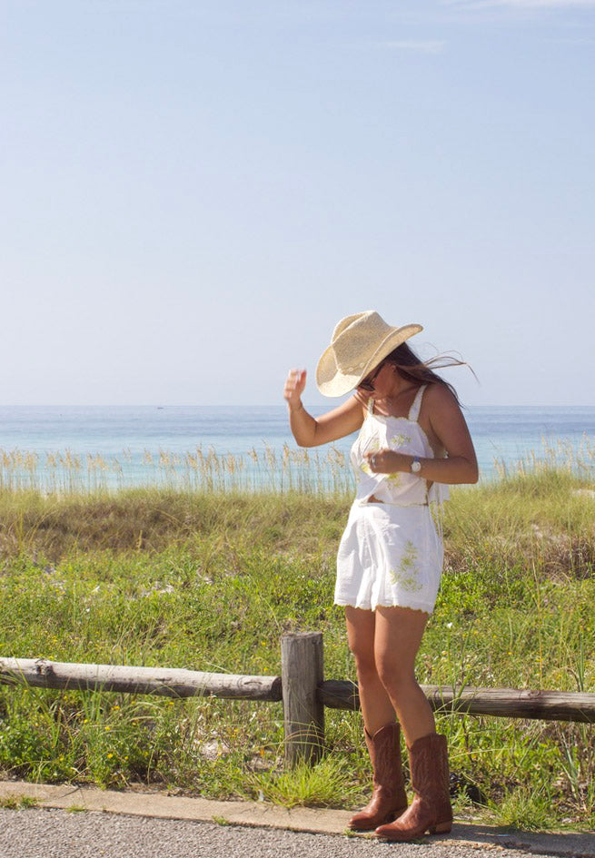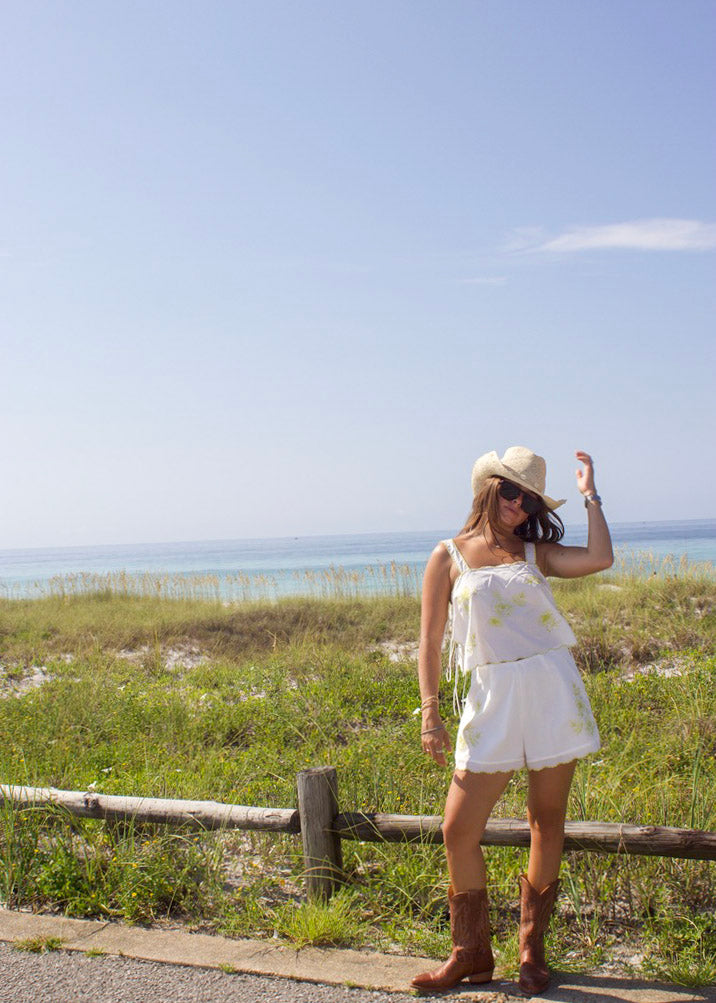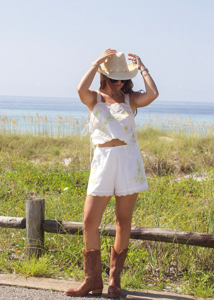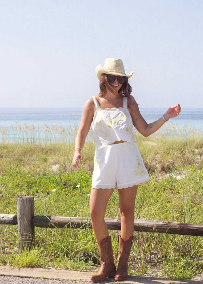 The Parc Top and Short Set combines delicate Lime floral embroidery with a chic scalloped edge for a fresh, feminine look. The sleeveless crop top features adjustable side ties and a semi-sheer design, perfect for warm weather. Paired with matching shorts that include a side zipper and comfortable lining, this set offers both style and ease for your everyday adventures.