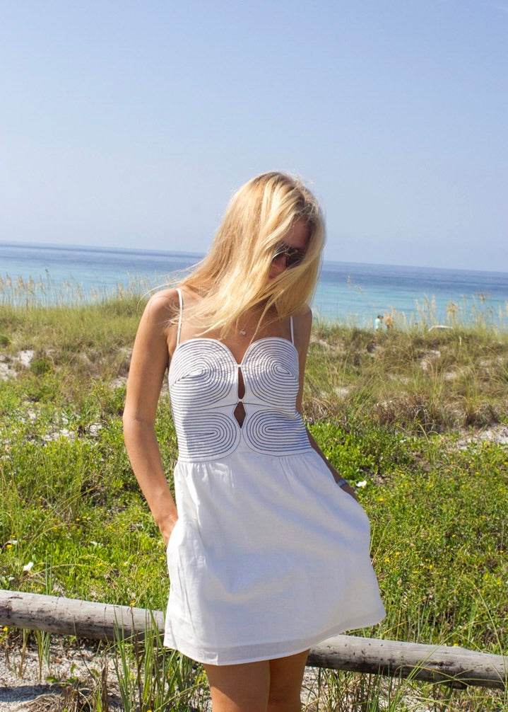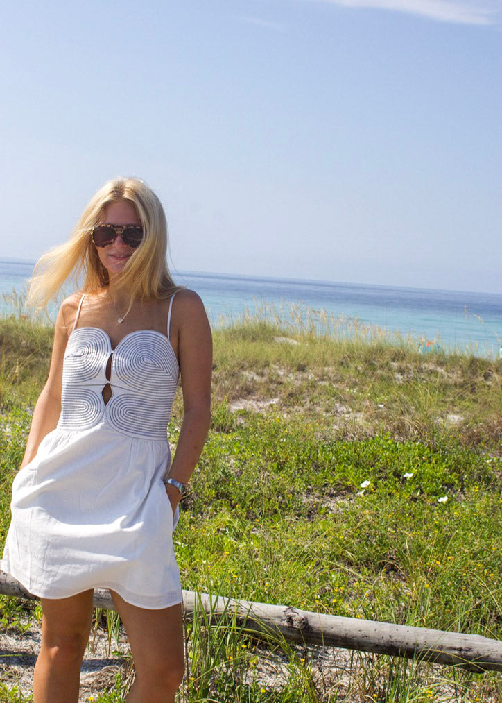 The Perry Dress combines a sculpted bodice with mesmerizing swirl details and playful cutouts, creating an effortlessly striking look. Its breezy white skirt adds lightness and movement, while adjustable straps ensure a perfect fit. Practical side pockets enhance functionality without sacrificing style, making this mini dress a flattering and versatile choice for any occasion.