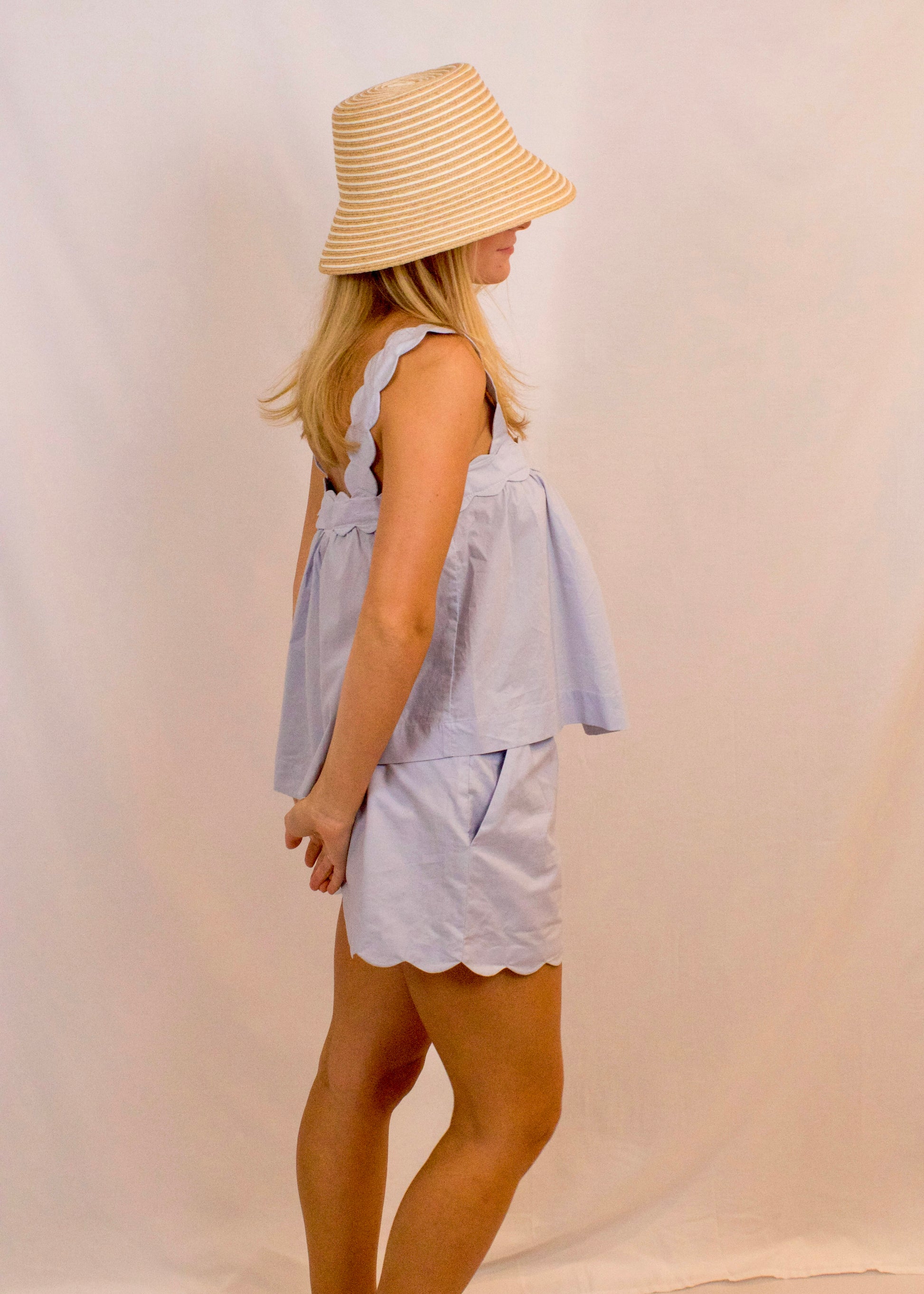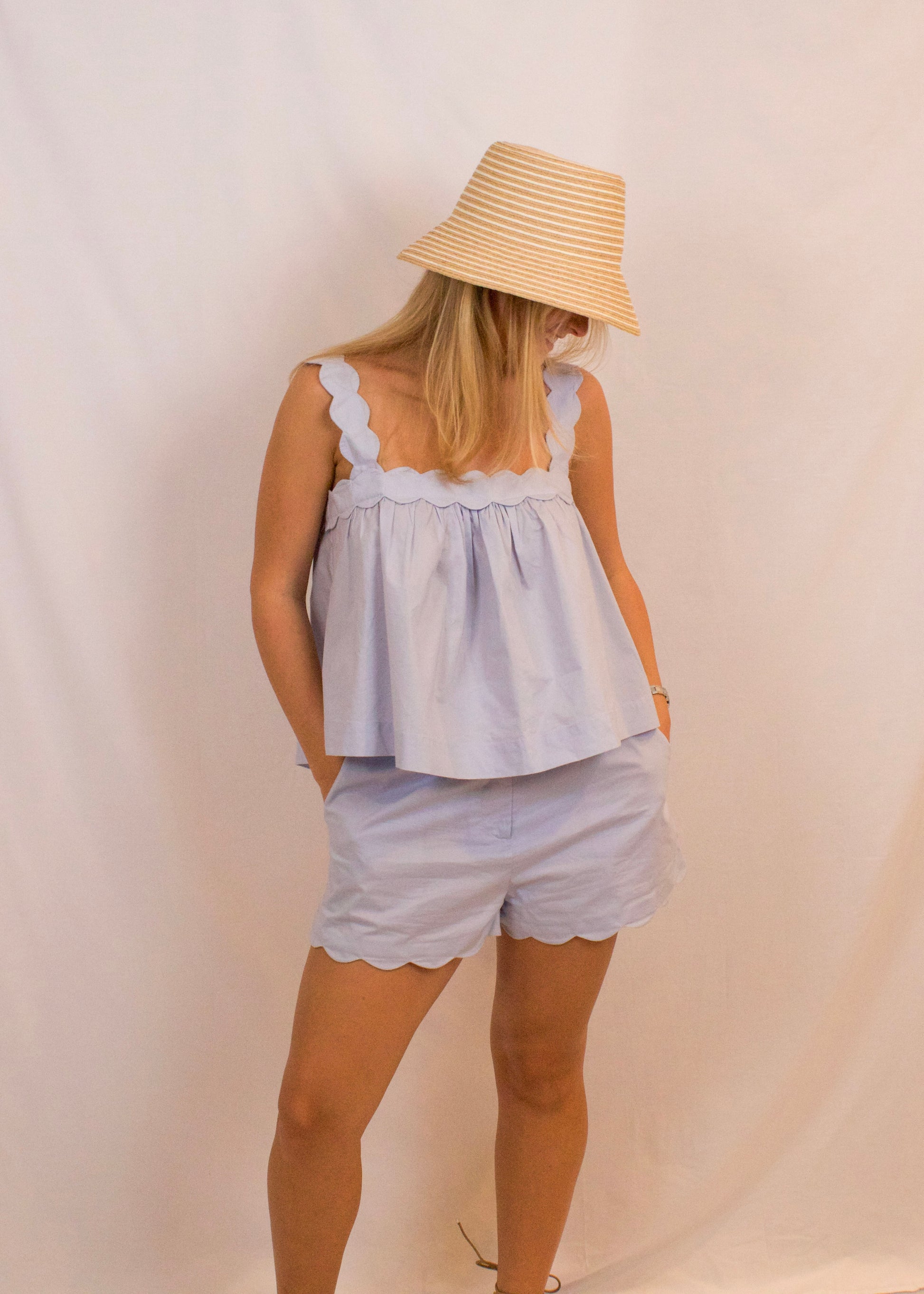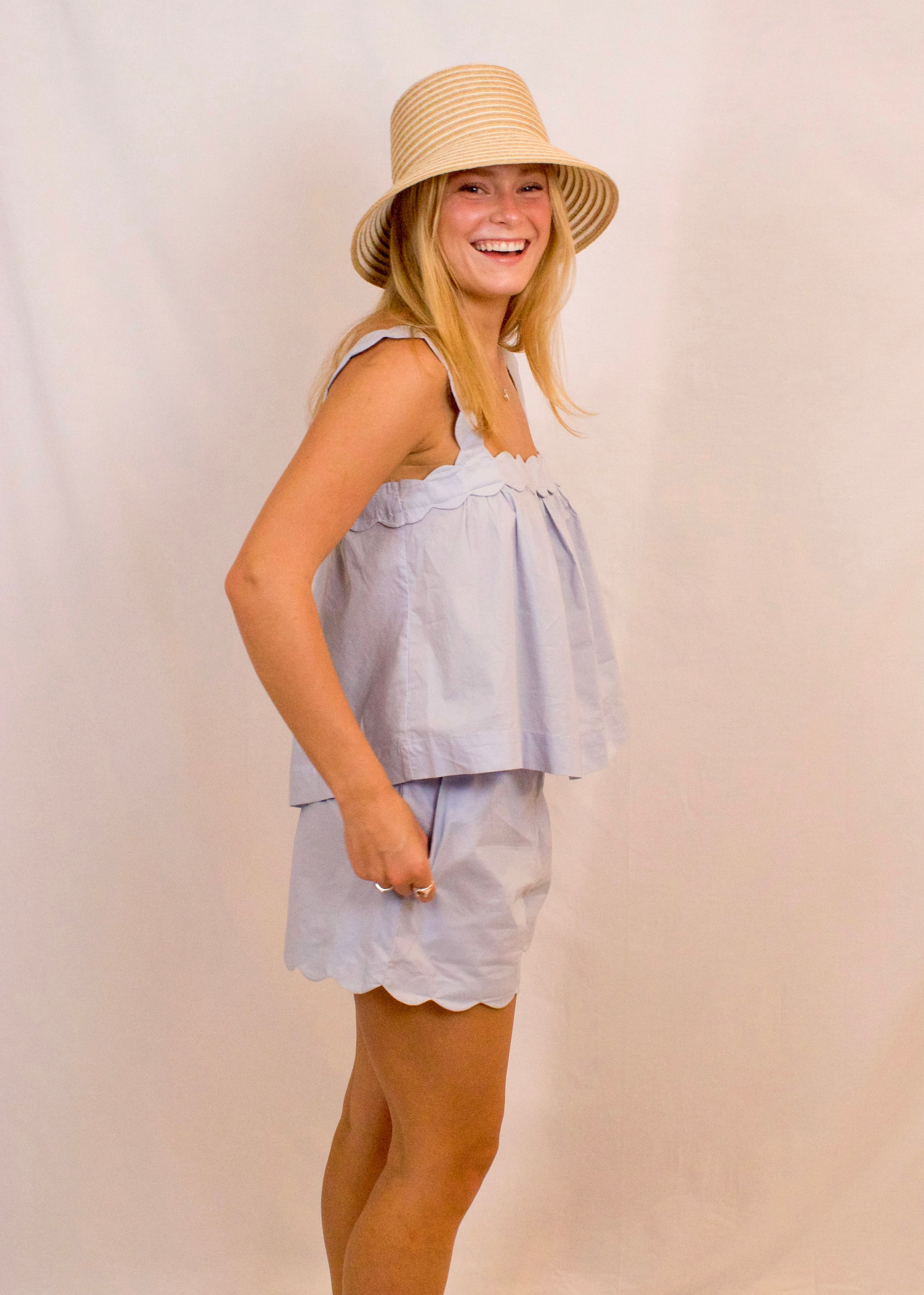 Elevate your summer wardrobe with this chic Scallop Top and Short Set in baby blue. The sleeveless top features delicate scalloped straps, perfectly complemented by matching shorts with a scalloped hem and stylish front button details. Fully lined for all-day comfort, this set combines effortless style with a flattering fit, making it ideal for warm days and casual outings.