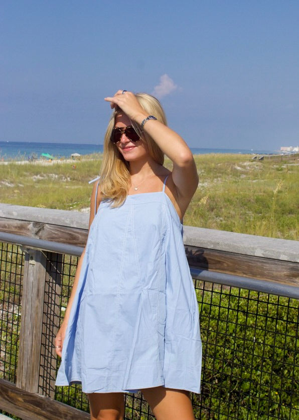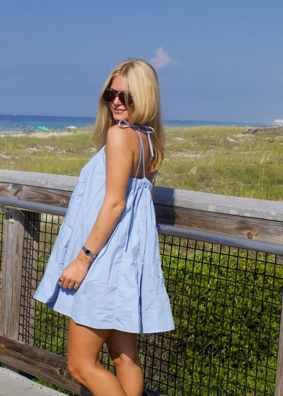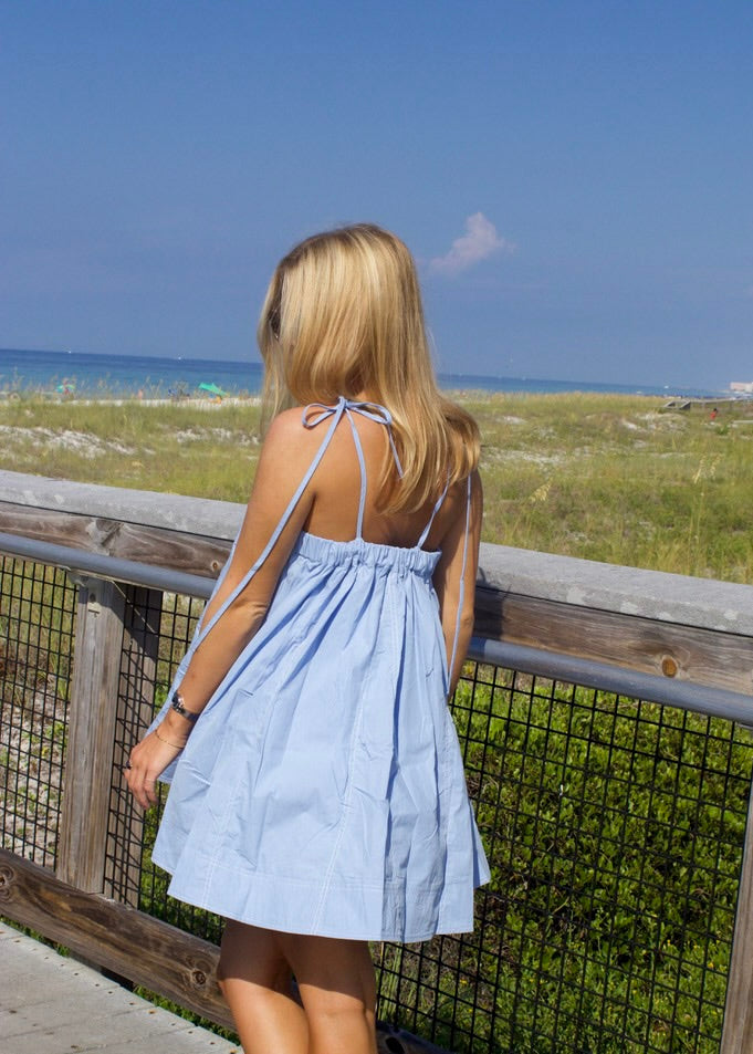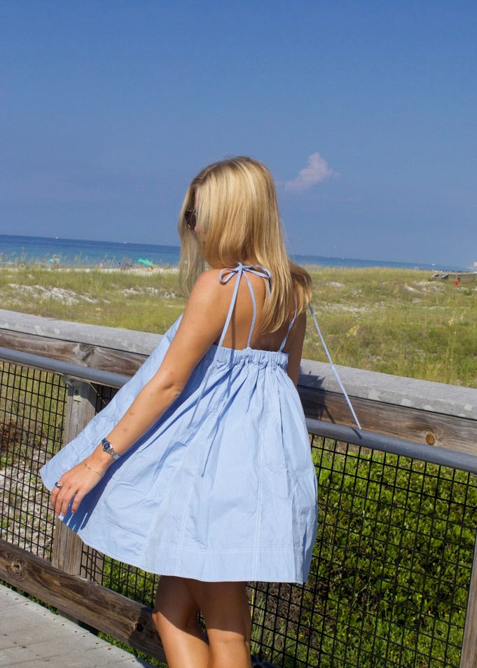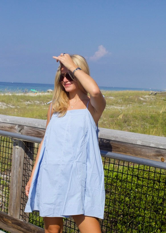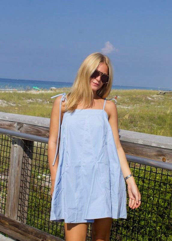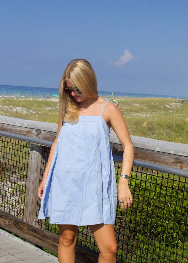 The Seaside Mini Dress in a soft powder blue offers a light, airy feel perfect for easy, stylish wear. With its thin tie straps and flowing shape accented by gentle seam details, it transitions seamlessly from relaxing beach outings to casual brunch gatherings.